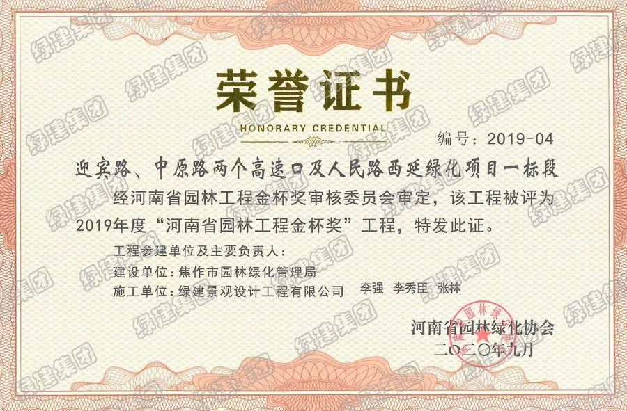 迎賓路、中原路兩個高速口項目榮獲2019年度河南省園林工程金杯獎